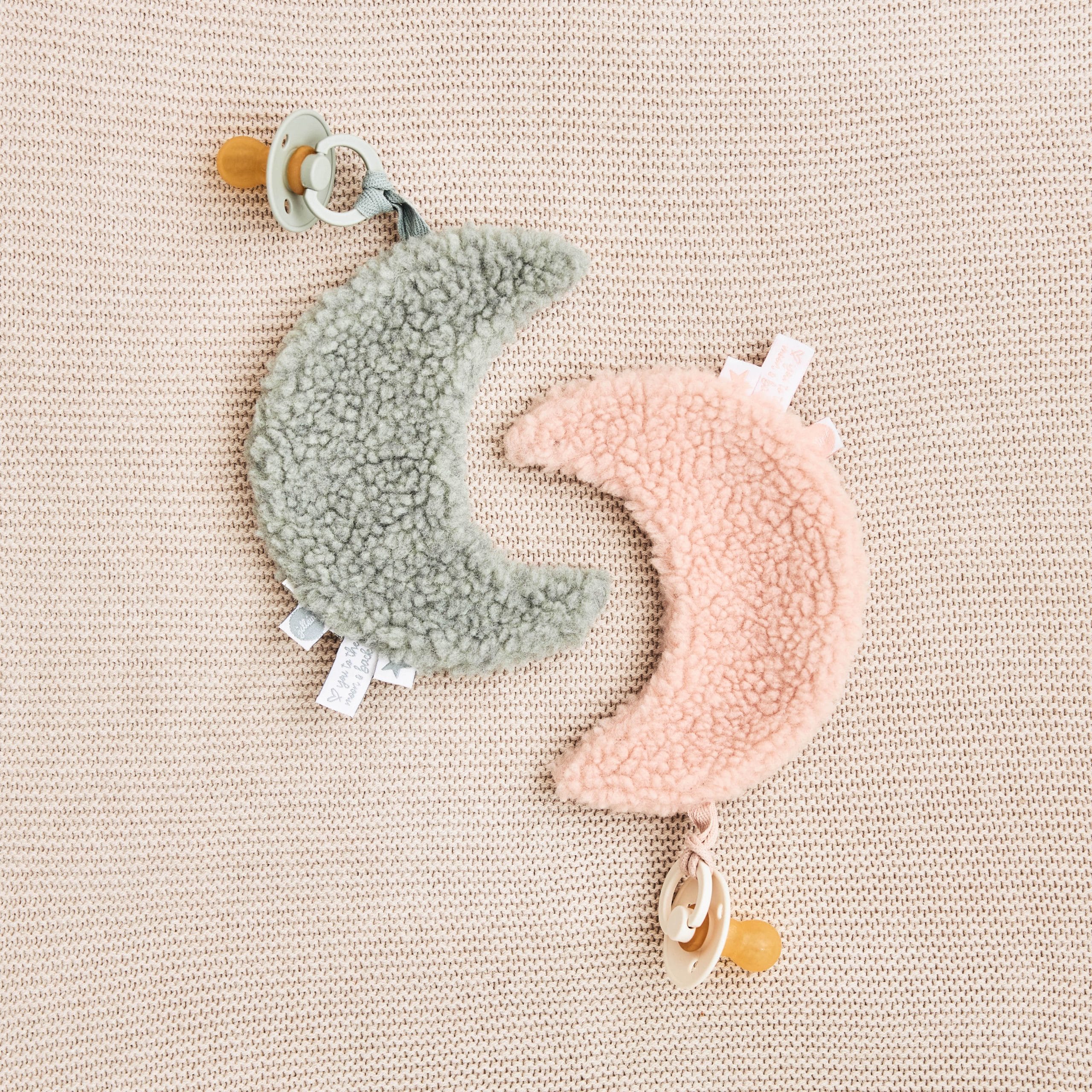Met deze maan speenknuffel kunnen babies en kinderen lekker knuffelen of spelen. Ook kan de speen hierdoor gemakkelijk weer teruggevonden worden als hij in de box of in het bedje ligt. Dit cuddledoekje is van heerlijk zachte teddystof. Kies jij voor Pale Pink roze, Ash Green groen of Nougat ecru?