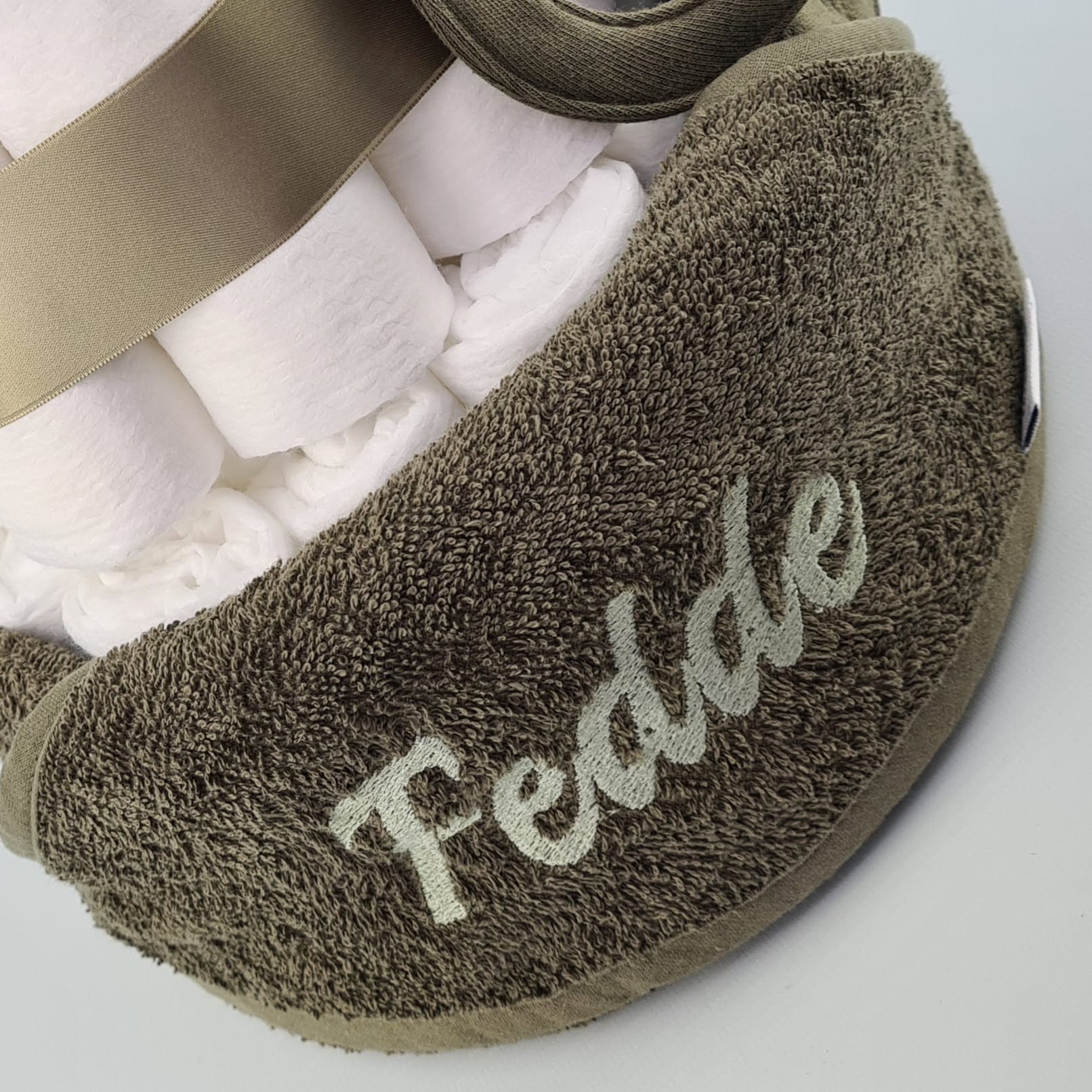 Deze prachtige luiertaart is speciaal voor liefhebbers van zowel simpel, als elegant, met een stoer randje. De luiertaart is opgemaakt in een mooie warme kleur forest green, gecombineerd met olijfgroen.