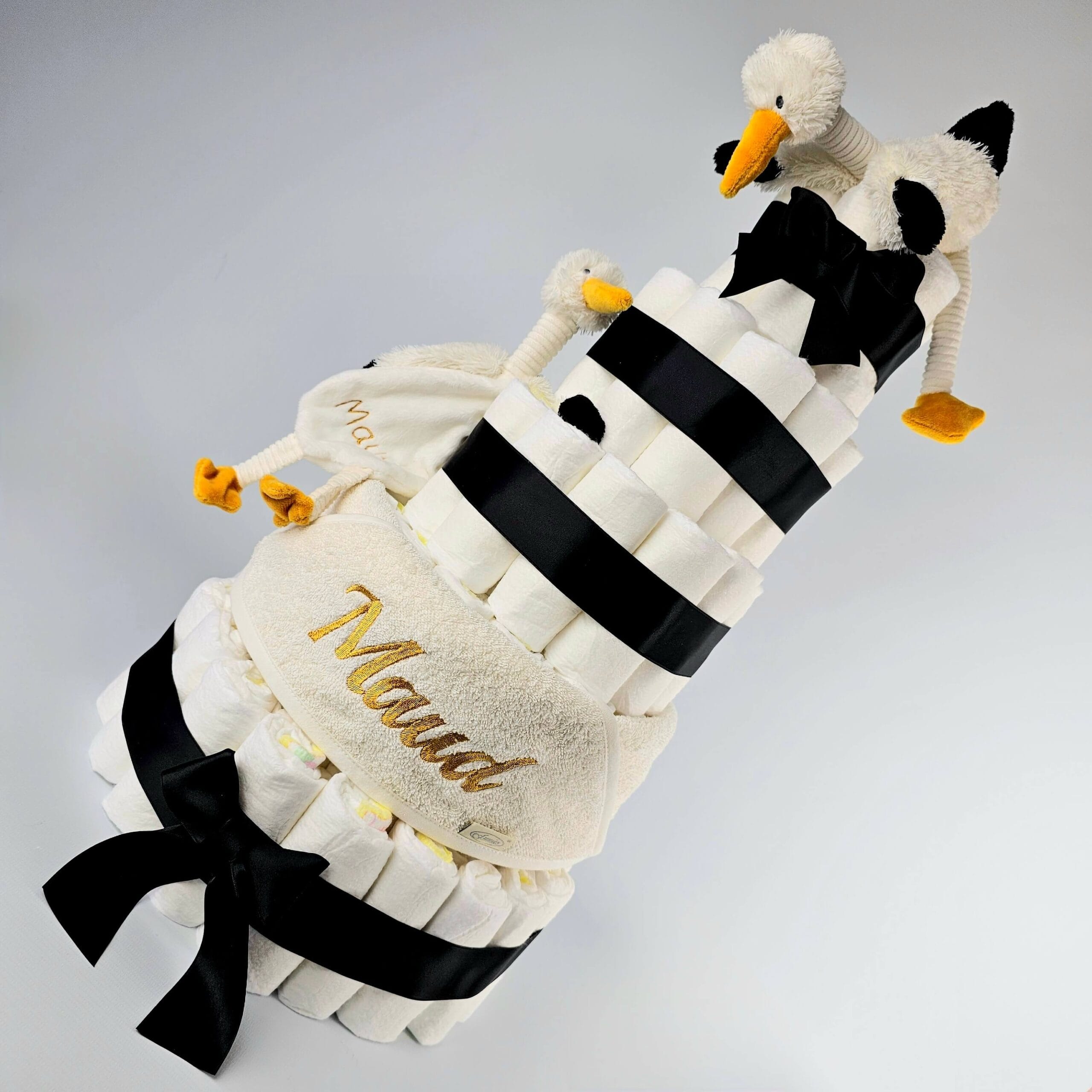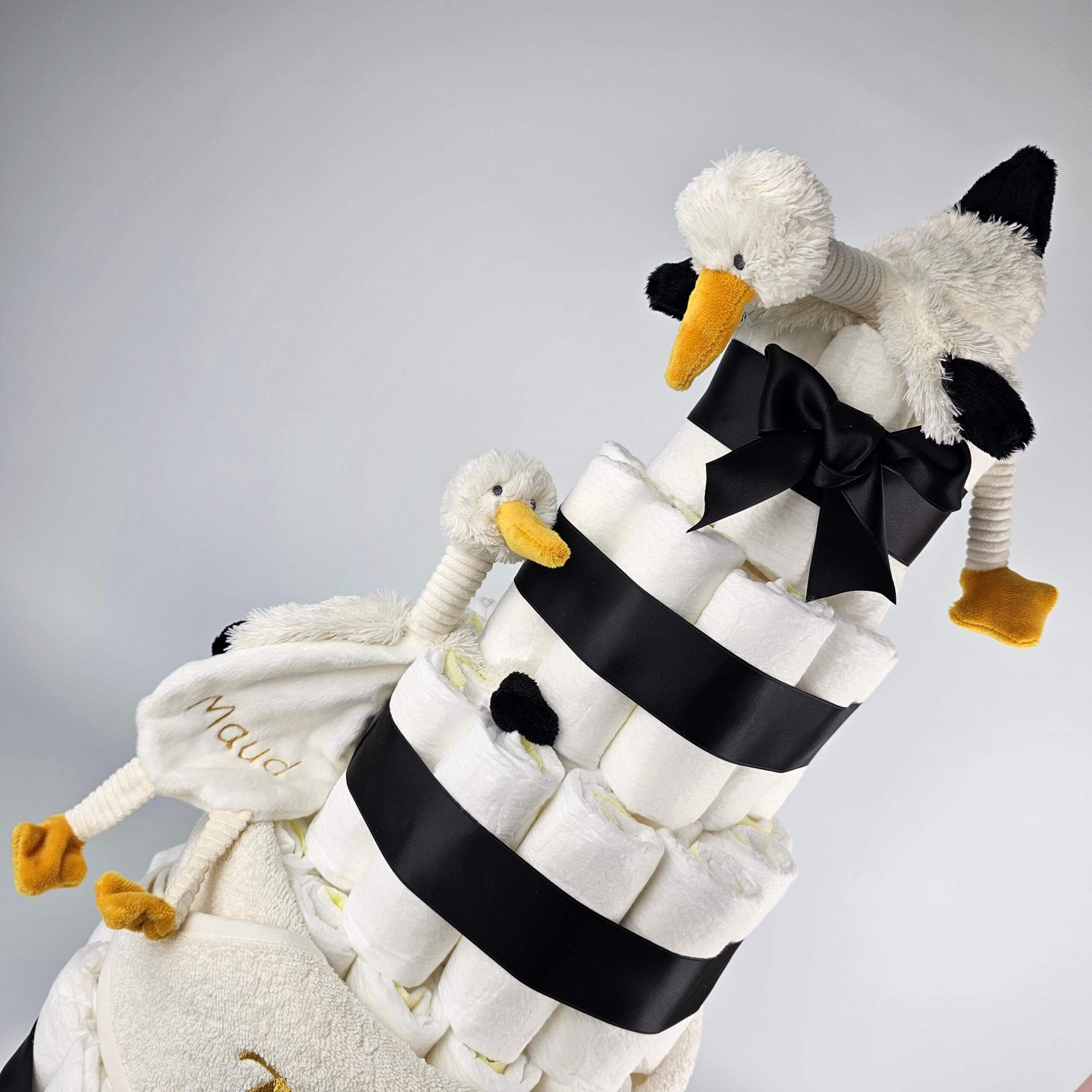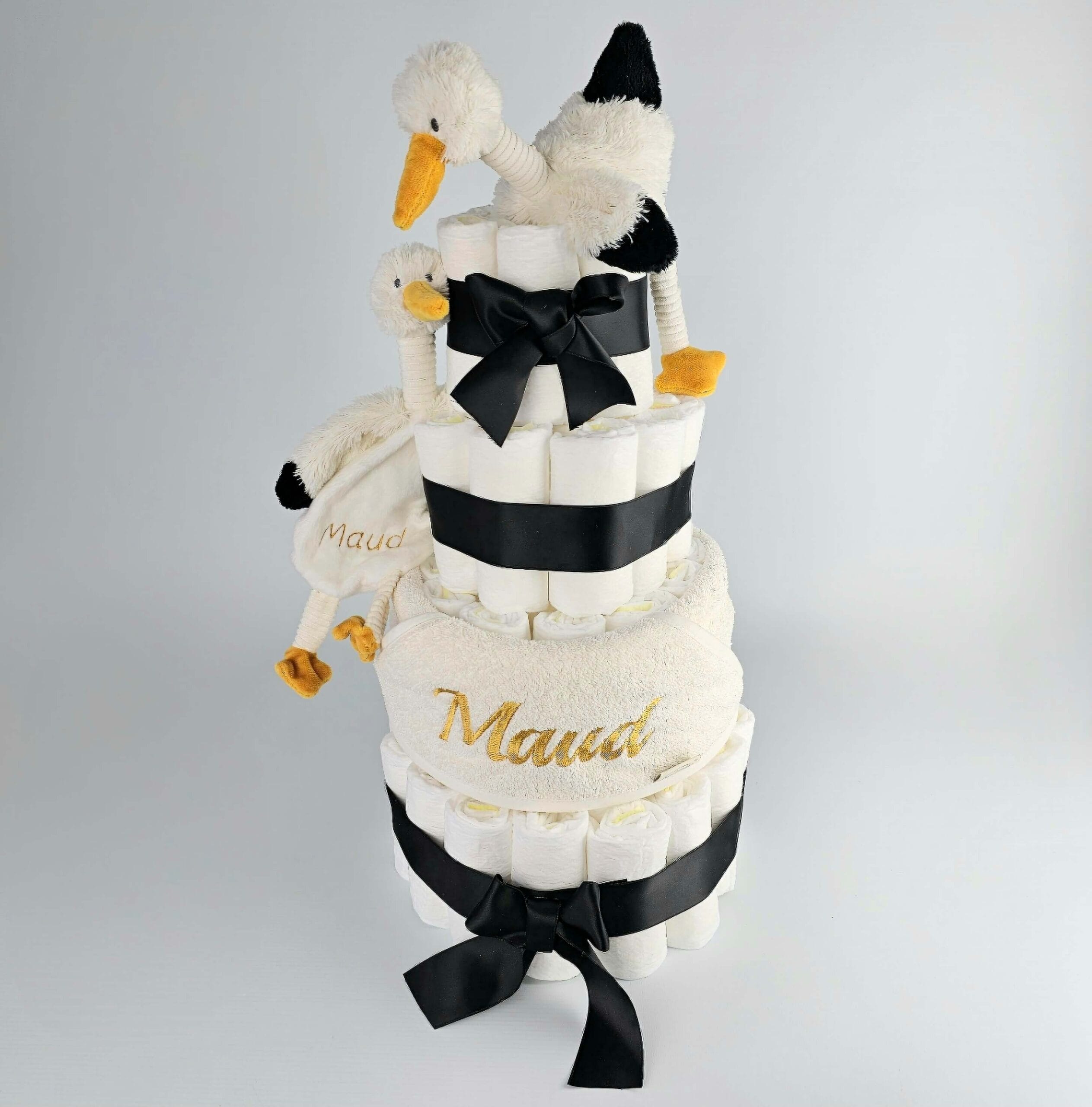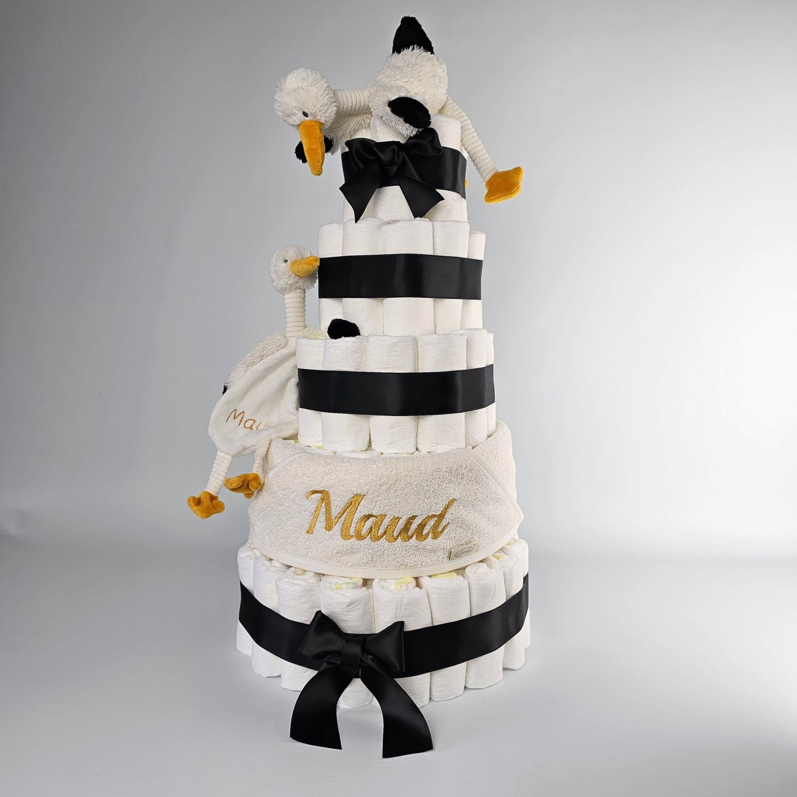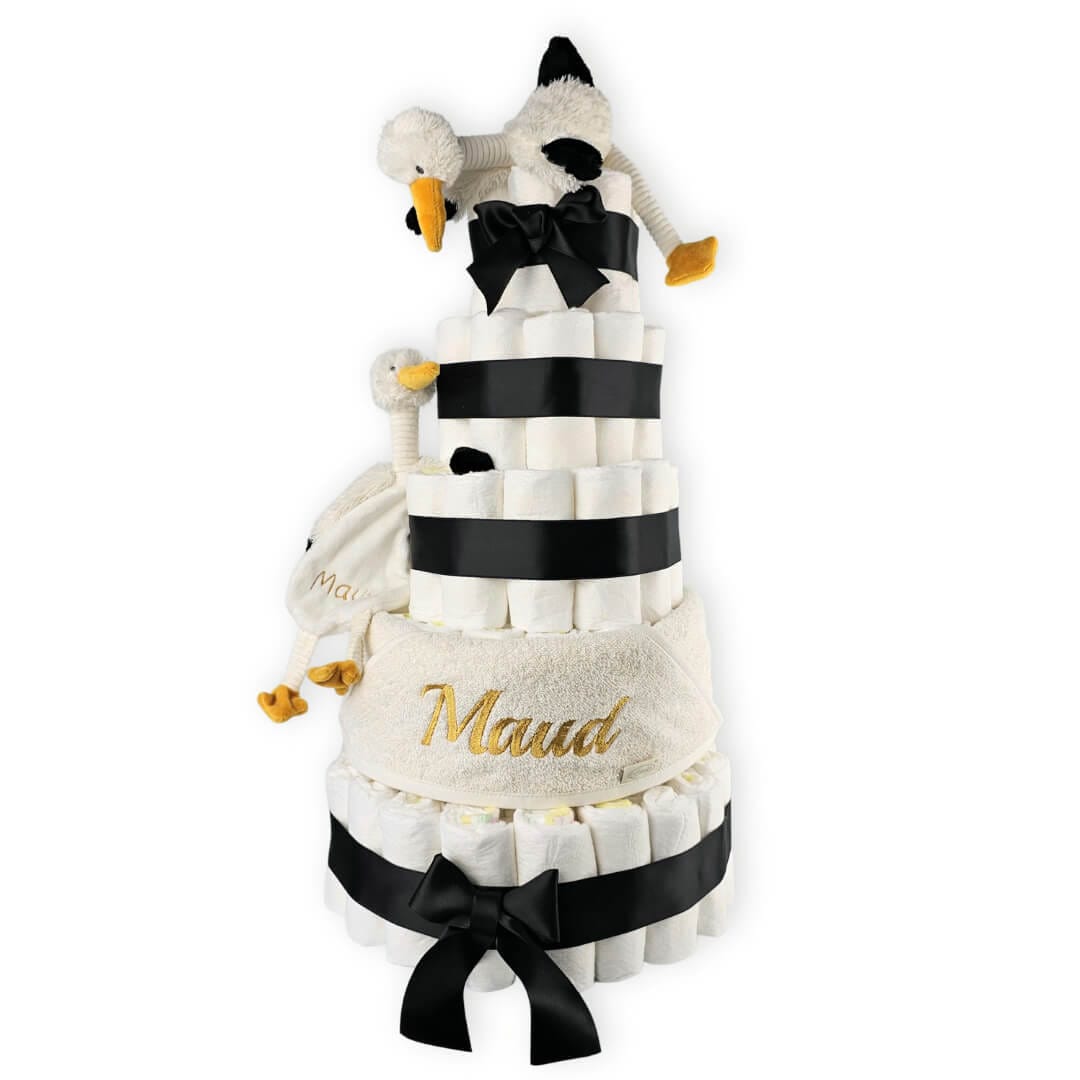 Deze prachtige luiertaart met zijn leuke set ooievaartjes staan symbool voor het blijde arriveren van de ooievaar en is daarmee een van onze meest geliefde luiertaarten. De luiertaart in formaat XL is opgemaakt in een mooie diepe kleur zwart, gecombineerd met details in okergeel.