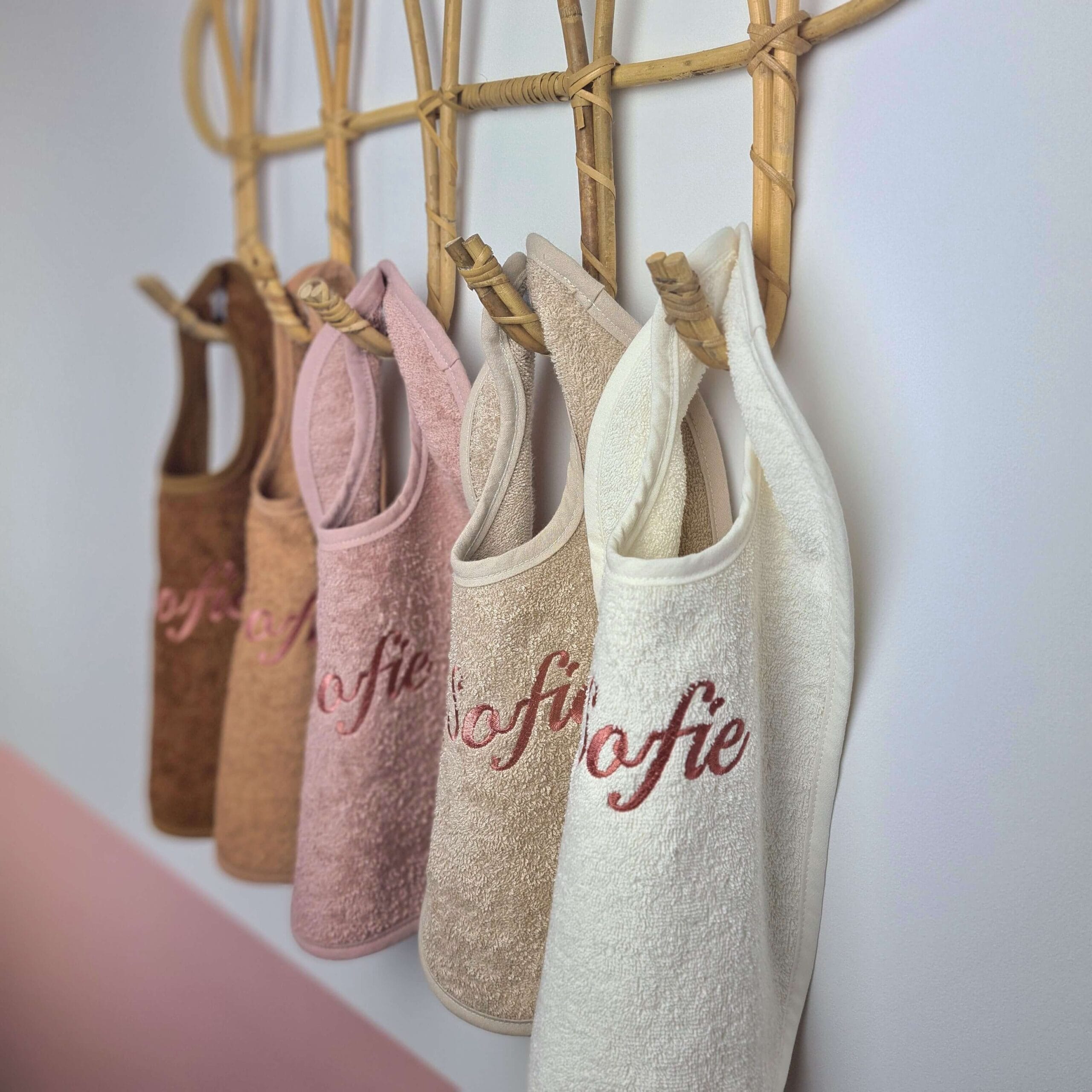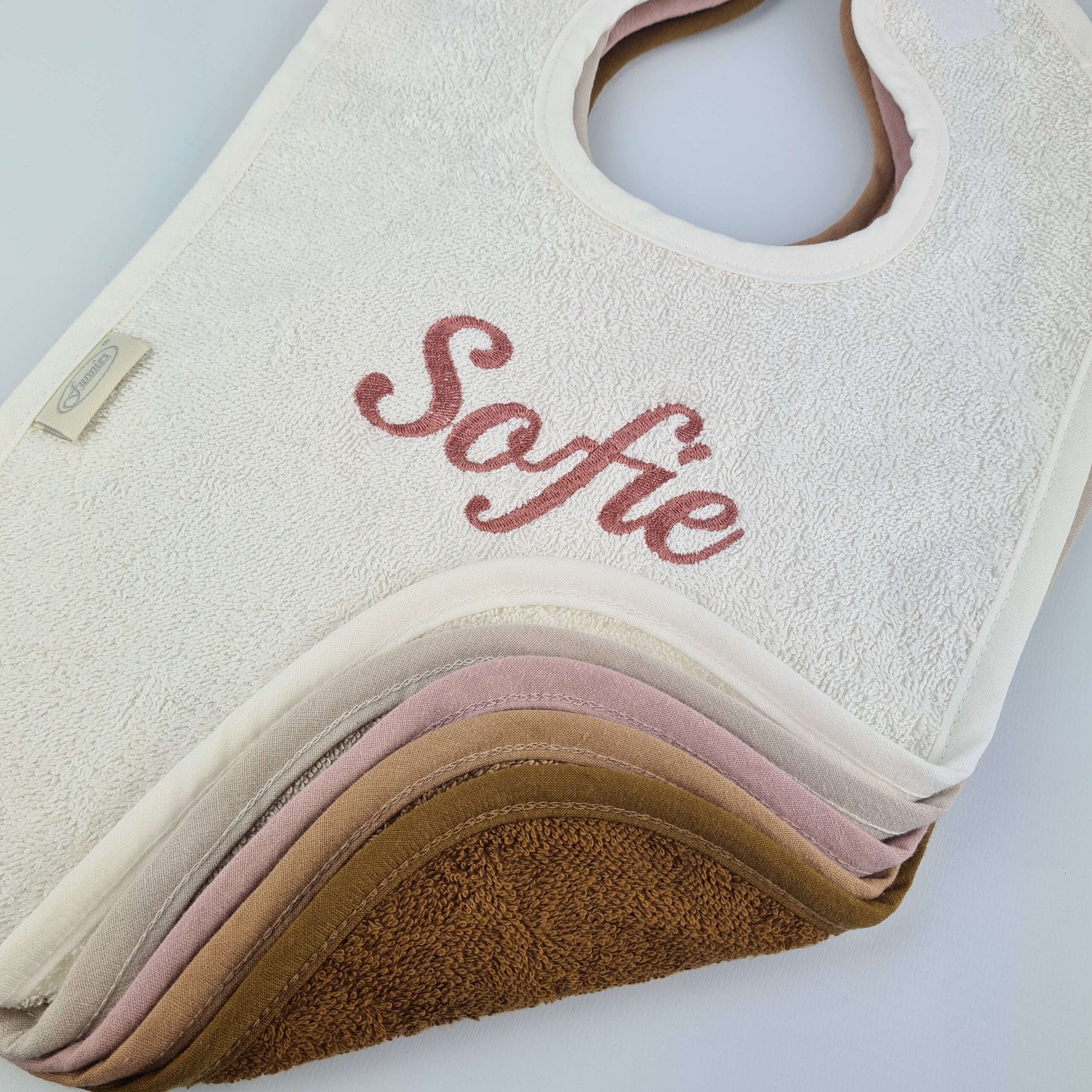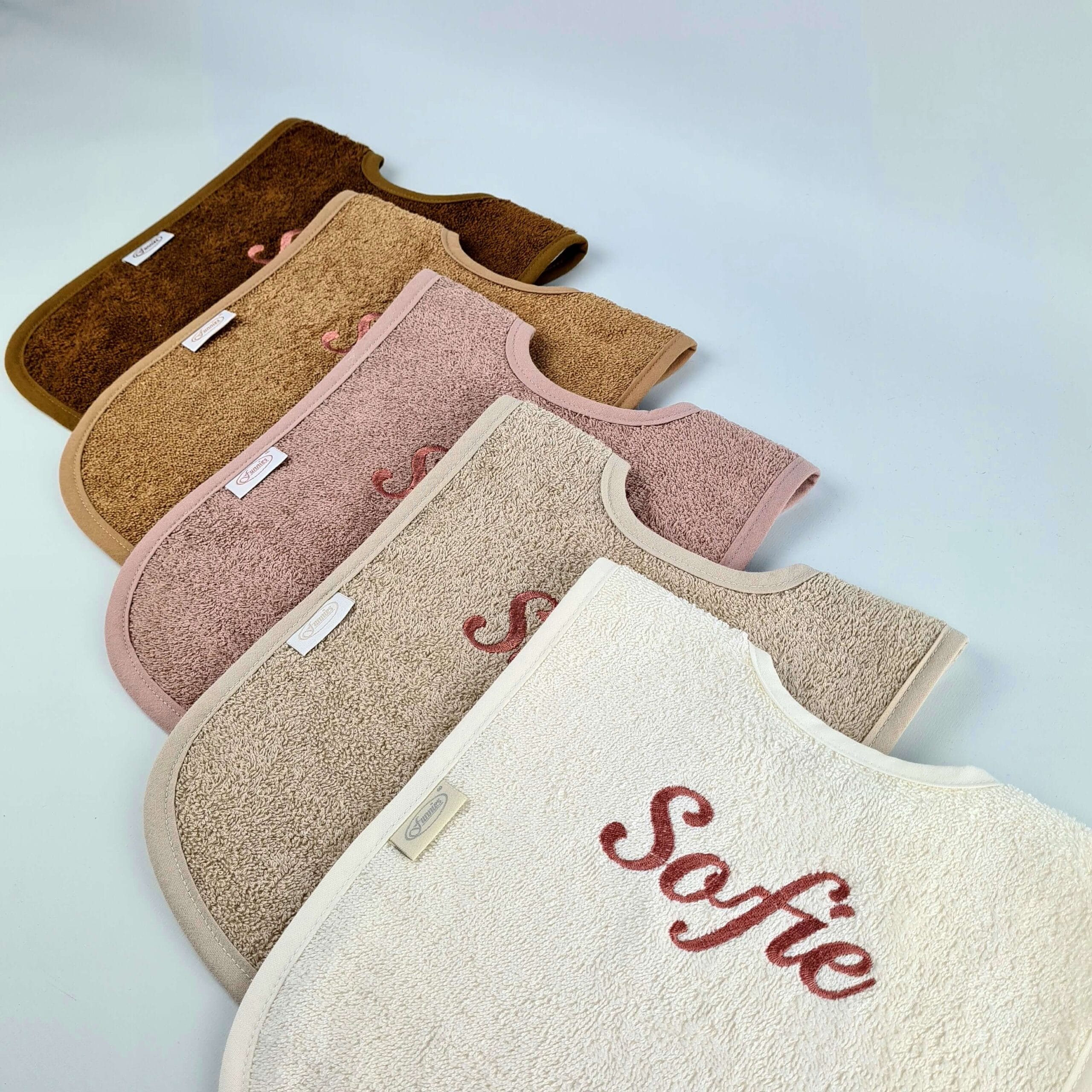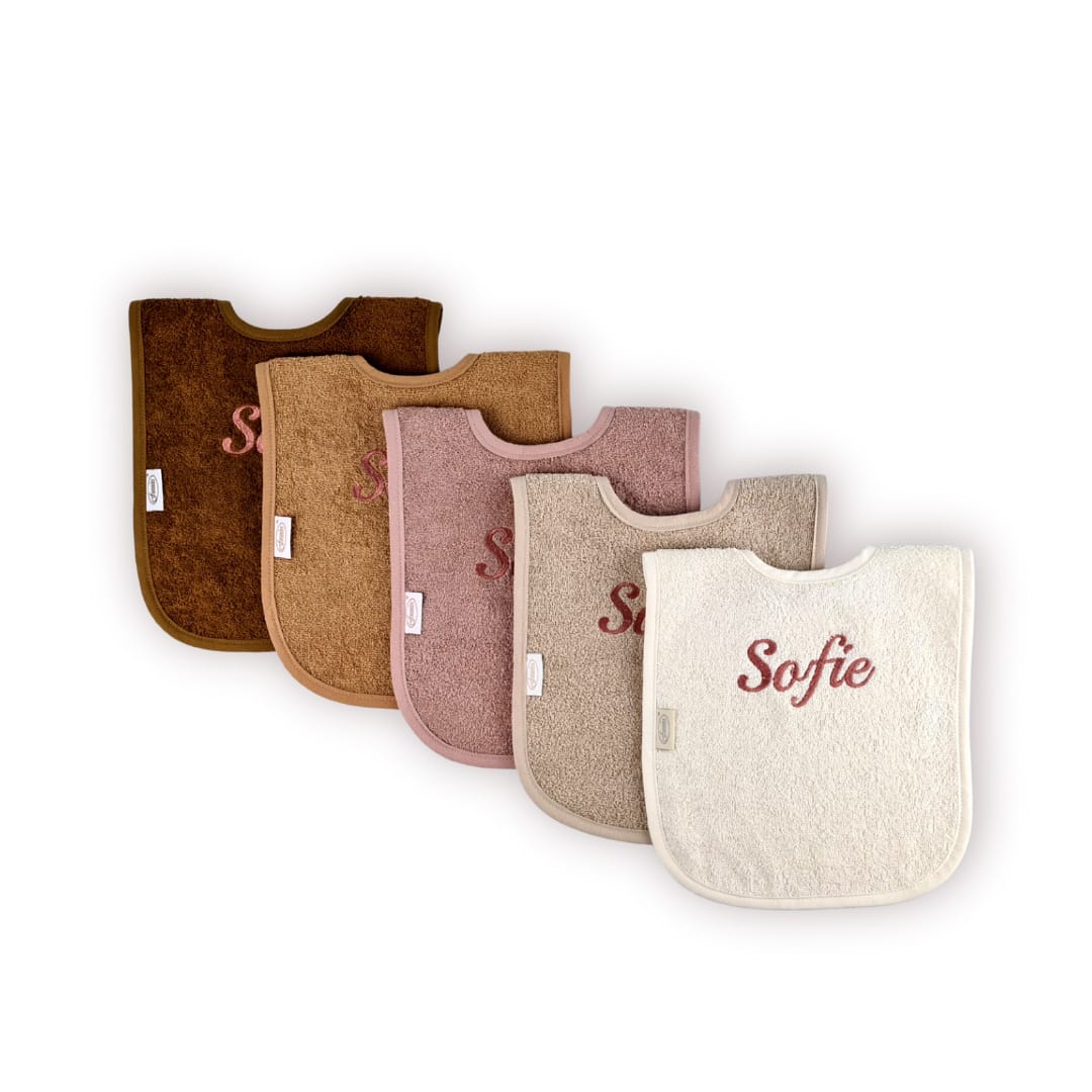 Deze gepersonaliseerde slabbetjes met duurzaam geborduurde naam, zijn verkrijgbaar in bruintinten met oud roze, bruintinten met oud blauw of bruintinten met oud groen.